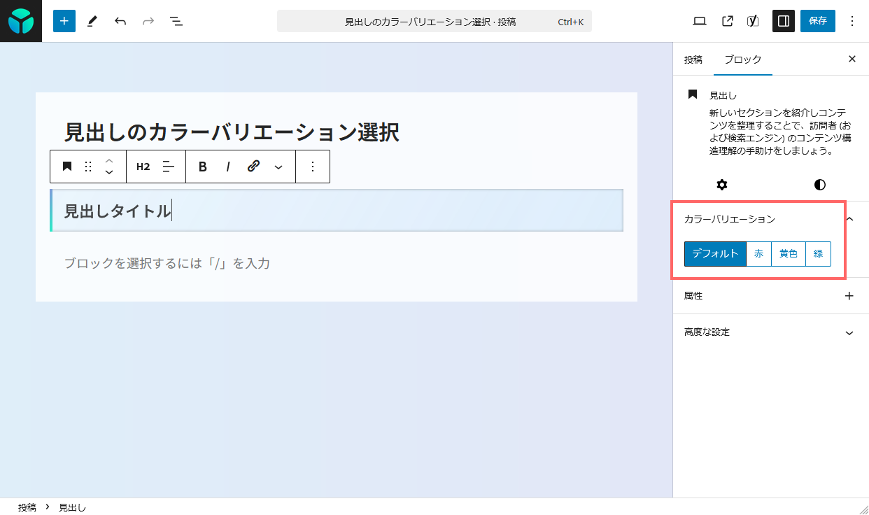 この記事では、ブロックエディタのインスペクター(右サイドバー)にカラーバリエーションを選べるボタンを追加して、見た目の切り替えが簡単にできるようにする方法を紹介します。